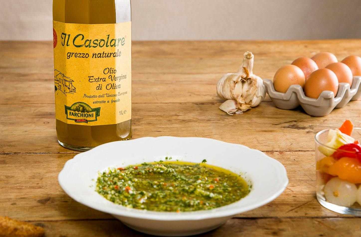 Once all the ingredients have been chopped, the sauce should be diluted and flavored with extra virgin oliveOlive Oil , which must be of high quality, otherwise all efforts will be in vain.