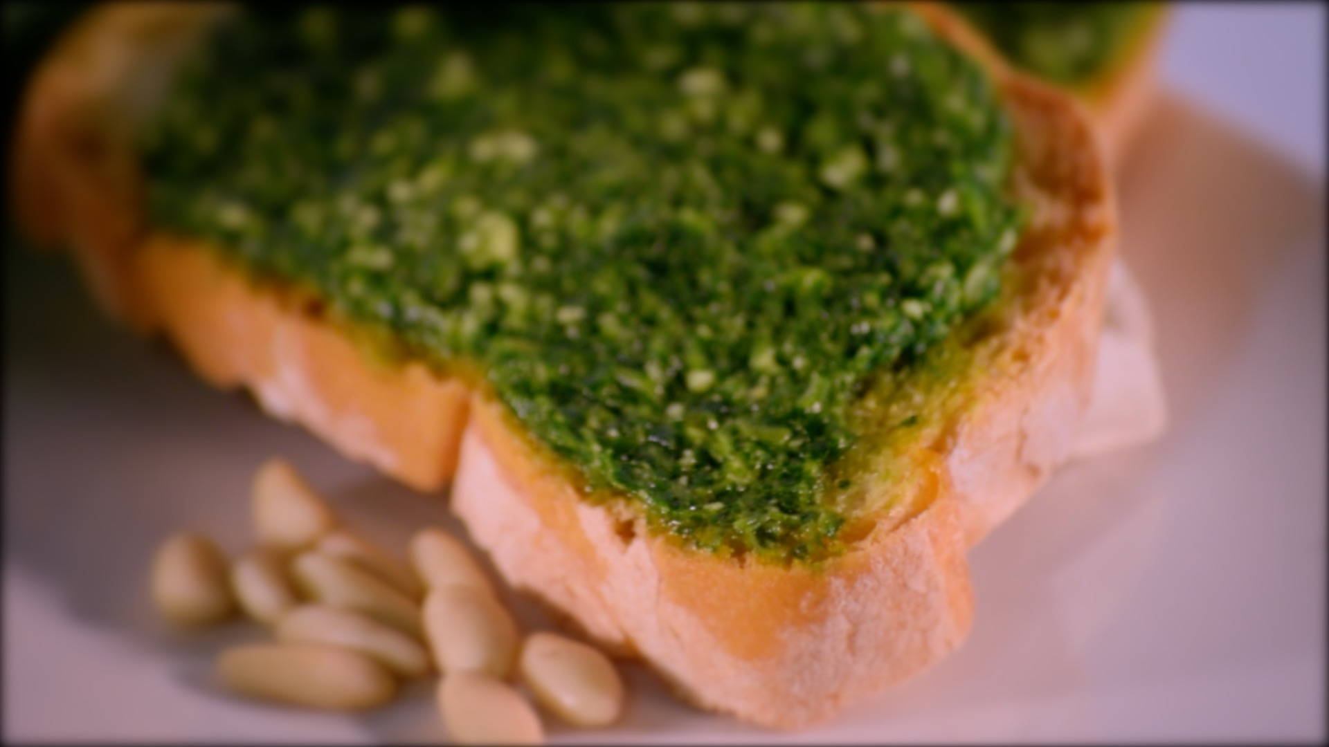 Bruschetta with arugula pesto: an easy and tasty recipe.