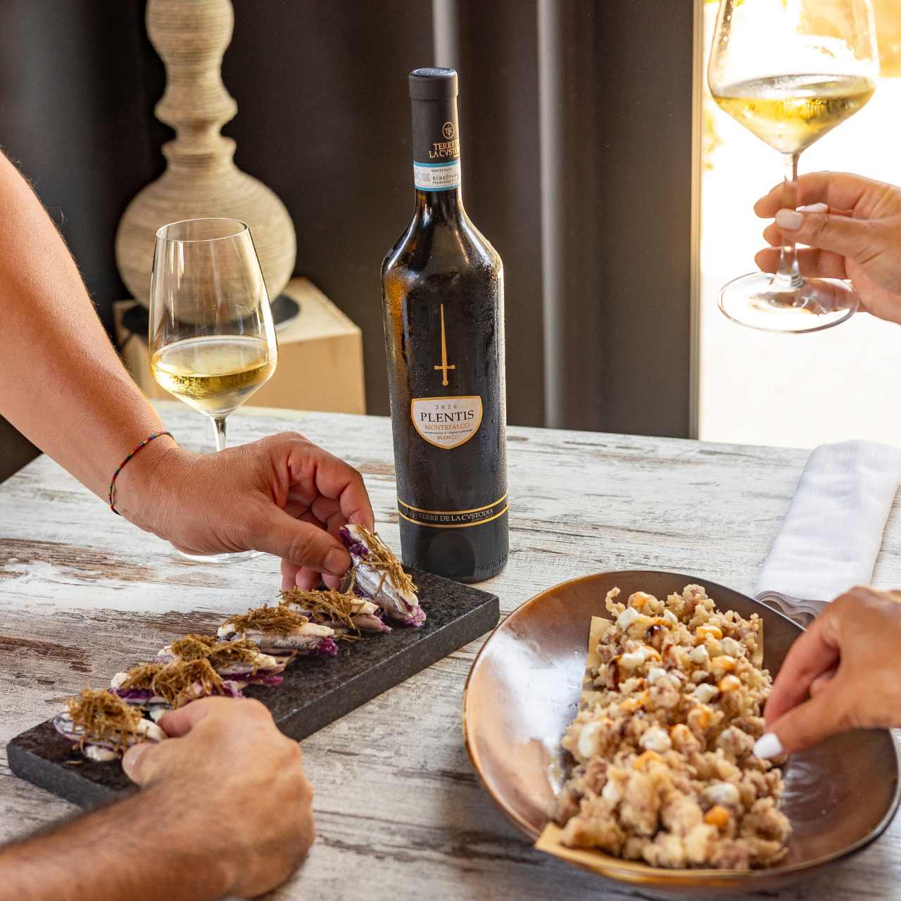 Made from native white grapes and Chardonnay, this wine comes from careful, modern winemaking. The grapes undergo cryomaceration of the skins, followed by temperature-controlled fermentation to preserve fragrance and freshness. Aging takes place in stainless steel, with subsequent resting for 6 months in the bottle.