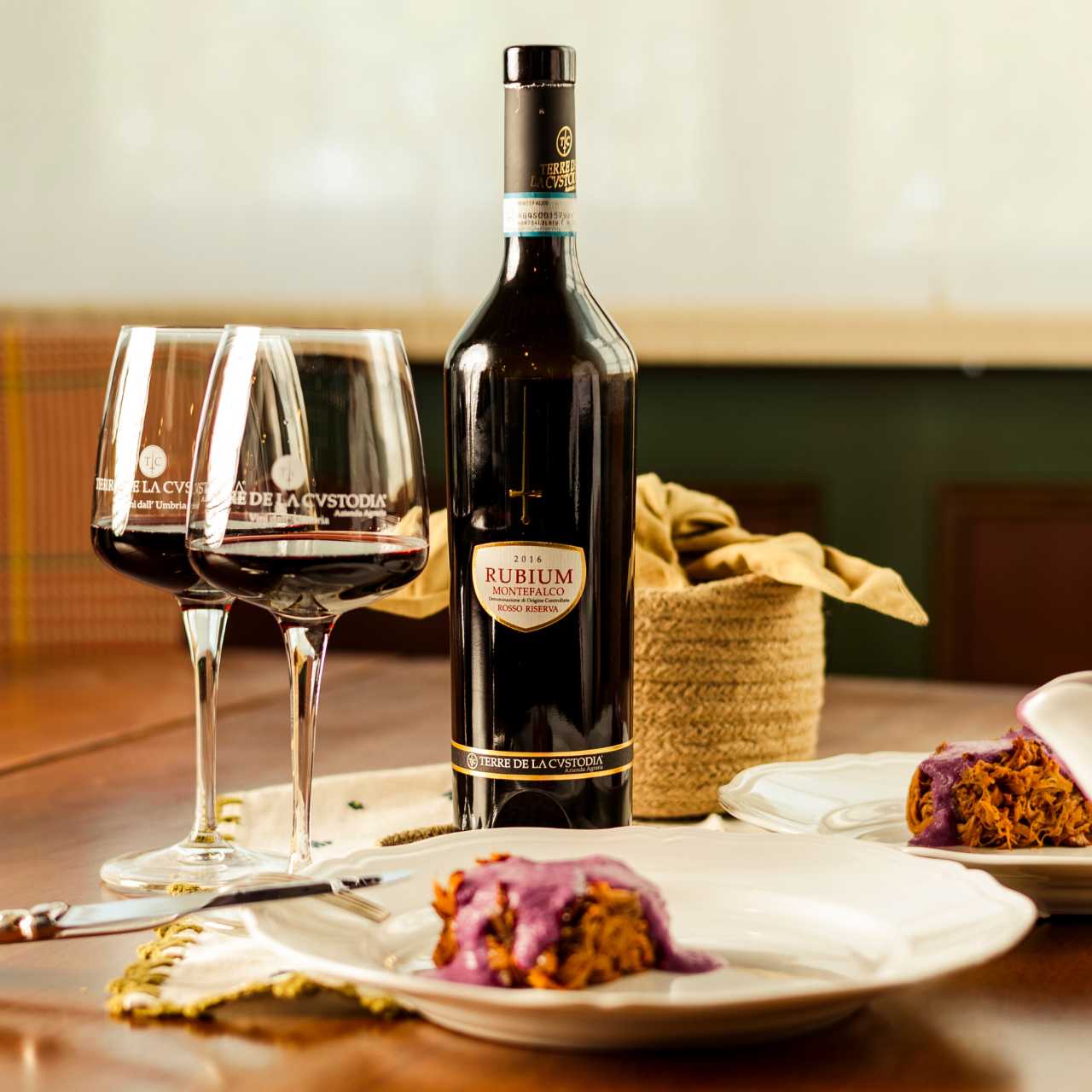 Red wine made from a selection of Sangiovese, Merlot and other indigenous Montefalco grapes grown in vineyards in Umbria. The full-bodied, velvety taste is accompanied by the aroma of berries and spices.