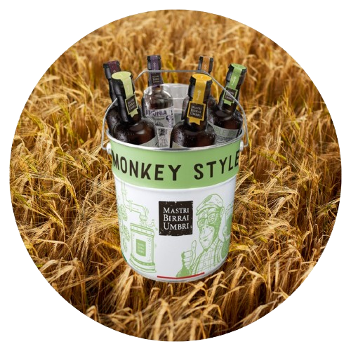 Le seau avec la sélection de bières Monkey Style. Pour découvrir les meilleures matières premières italiennes (comme les malts d'orge et les lentilles) et les ingrédients les plus insolites (comme le houblon américain).