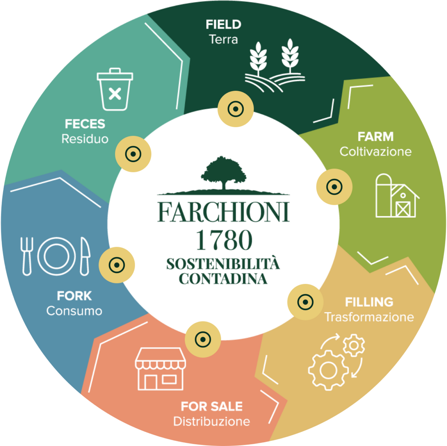 Farchioni controlla interamente le fasi produttive, dal campo alla realizzazione dei prodotti finiti (Field-Farm-Filling) e cerca di influire positivamente sulle restanti fasi del processo (For Sale-Fork-Feces) attraverso azioni di comunicazione e con un’attenta realizzazione dei propri prodotti sin dalla loro progettazione (Food by Design), anche al fine di aiutare il consumatore nell’utilizzo o il riciclo dei materiali di packaging.