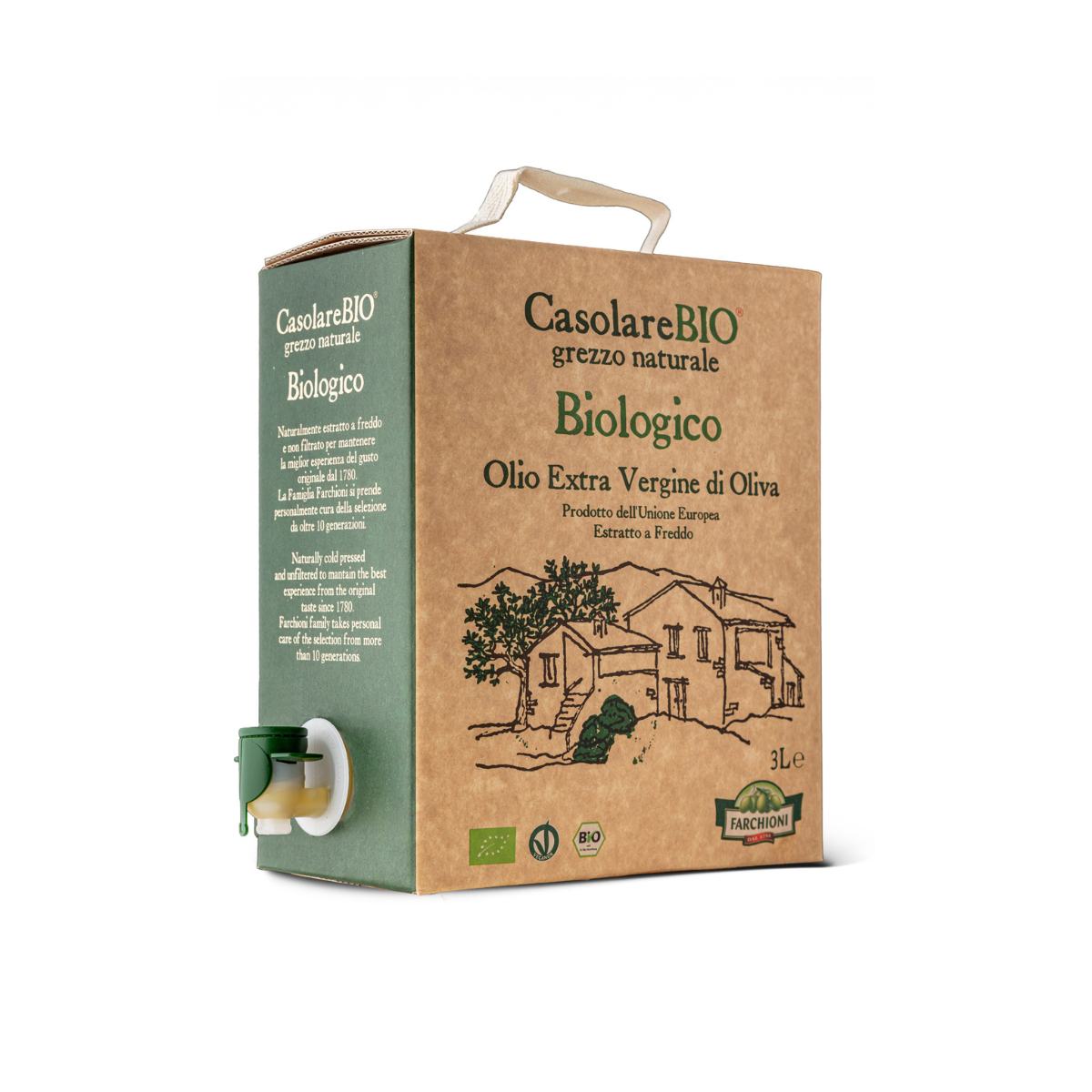 Olio Extra Vergine biologico non filtrato dal gusto equilibrato e leggermente fruttato, ora disponibile anche nel pratico e innovativo formato Bag In Box da 3L.