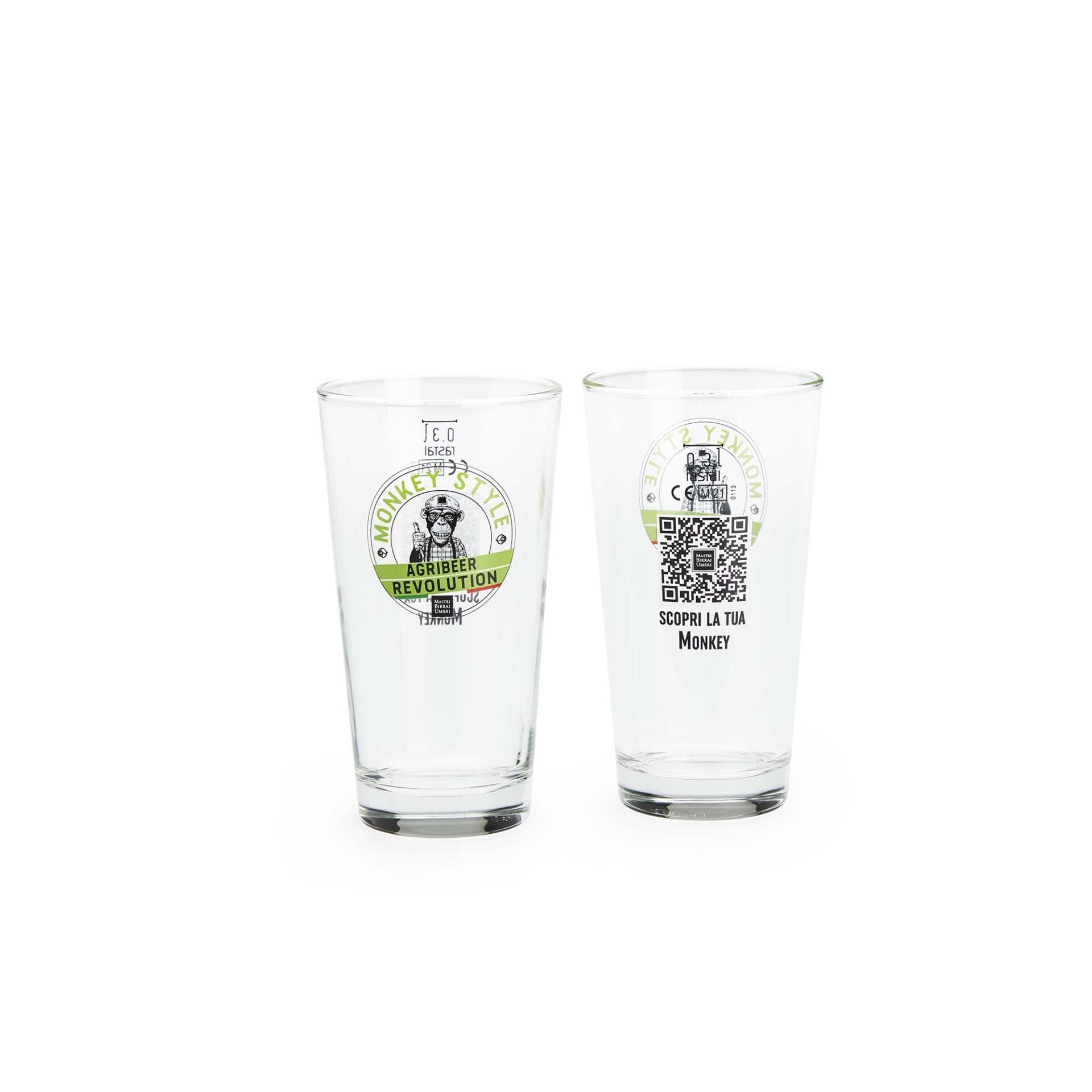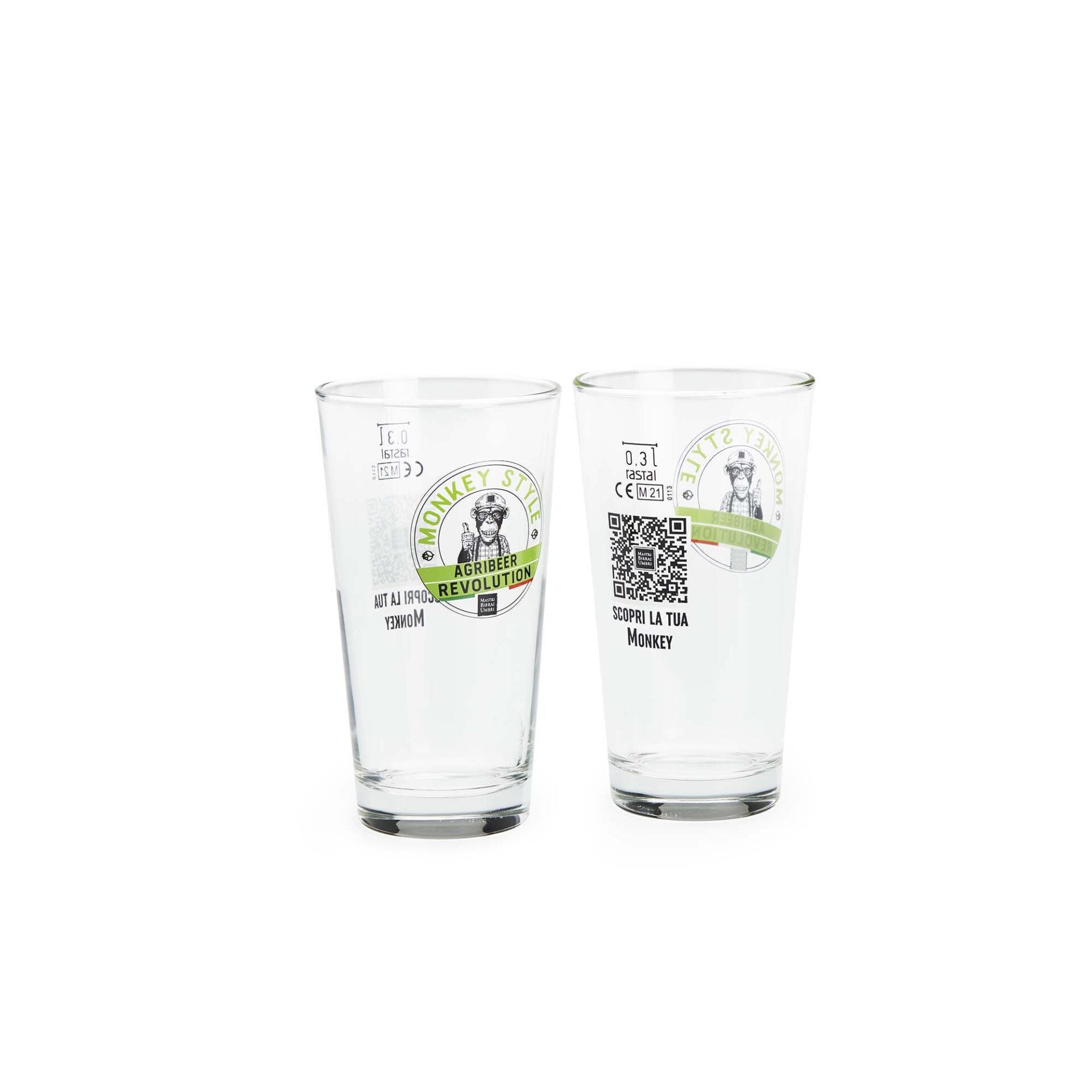 Set di 6 bicchieri Sestriere 0,30 cl, in vetro, con logo Monkey Agribeer Revolution. Per tutti gli amanti della birra che meritano un bicchiere all'altezza del suo contenuto e che non intendono rinunciare, neanche a casa, allo stile inconfondibile dei sapienti artigiani umbri.